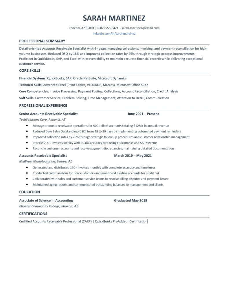 Your skills section should also include core AR competencies like invoice processing, payment posting, collections management, account reconciliation, credit analysis, and aging report generation. These keywords align with what ATS systems scan for in AR positions.