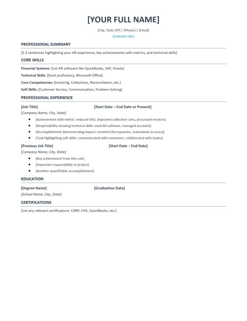 The structure matters just as much as the content. Based on analysis of what gets candidates hired in 2025, your AR resume should follow this order: header with contact information, professional summary, core skills section, professional experience, education, and certifications.