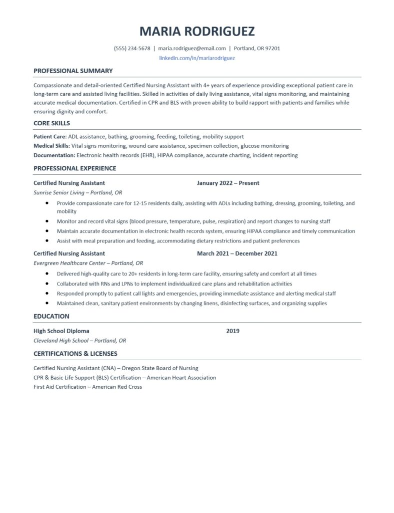 Strong example: “Compassionate and detail-oriented Certified Nursing Assistant with 4+ years of experience providing exceptional patient care in long-term care and assisted living facilities. Skilled in ADL assistance, vital signs monitoring, and maintaining accurate EHR documentation. Certified in CPR and BLS with proven ability to build rapport with patients and families while ensuring dignity and comfort.”