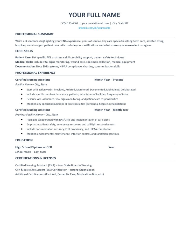 - Quantify your patient care experience with specific numbers like “provided care for 15+ residents daily” rather than vague descriptions
