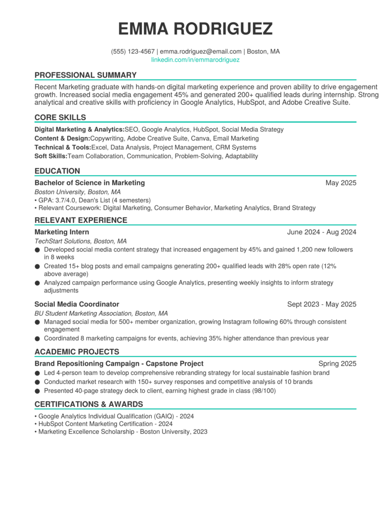 • ATS optimization matters even for entry-level positions, so include relevant keywords from job descriptions naturally throughout your resume.
