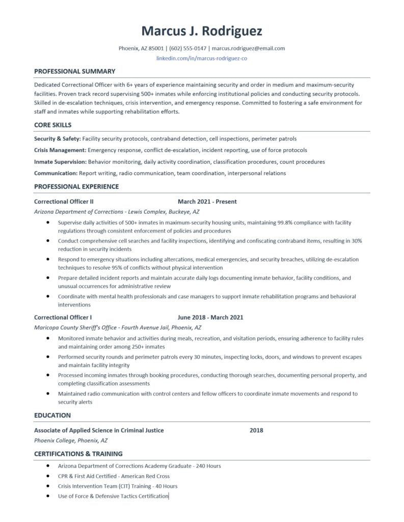 Use bullet points that start with strong action verbs and include specific metrics. Instead of “Responsible for inmate supervision,” write “Supervised daily activities of 500+ inmates in maximum-security housing units, maintaining 99.8% compliance with facility regulations through consistent enforcement of policies and procedures.”