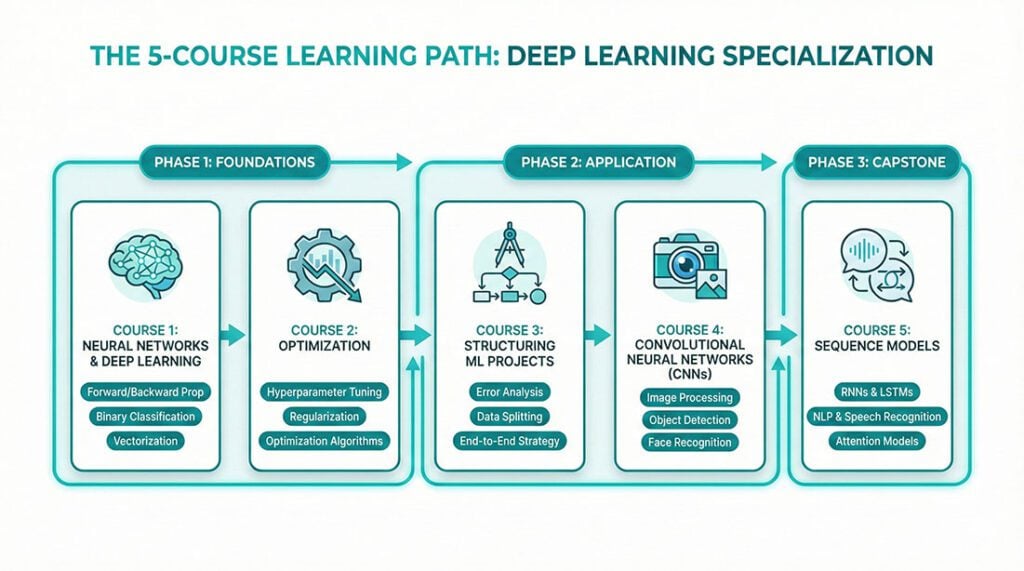 What You’ll Master: ML project strategy and computer vision, which is where this specialization gets directly career-relevant.