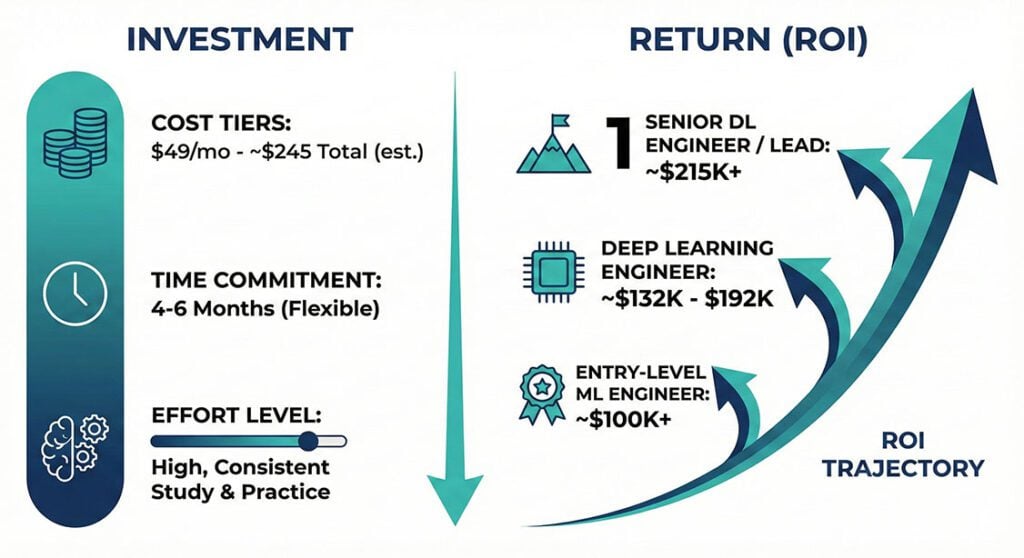 • Deep learning engineers earn $132K to $192K in total compensation, making this one of the highest-ROI certifications you can complete for under $300.