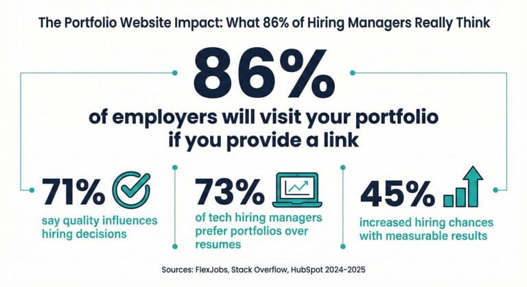 For developers specifically, the numbers get even more compelling. According to the Stack Overflow Developer Survey 2024, 73% of hiring managers consider a strong portfolio more important than a perfect resume for developer roles. That’s a dramatic shift from traditional hiring practices.