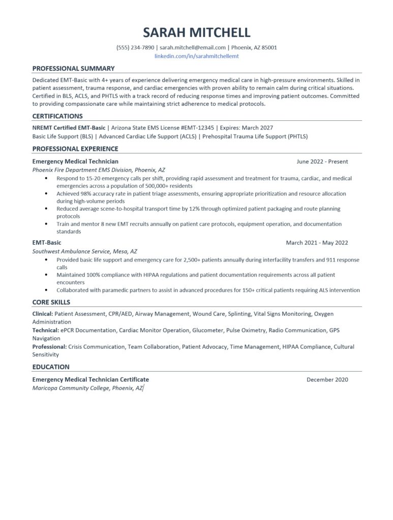 Strong example: “Dedicated EMT-Basic with 4+ years of experience delivering emergency medical care in high-pressure environments. Skilled in patient assessment, trauma response, and cardiac emergencies with proven ability to remain calm during critical situations. Certified in BLS, ACLS, and PHTLS with a track record of reducing response times and improving patient outcomes.”