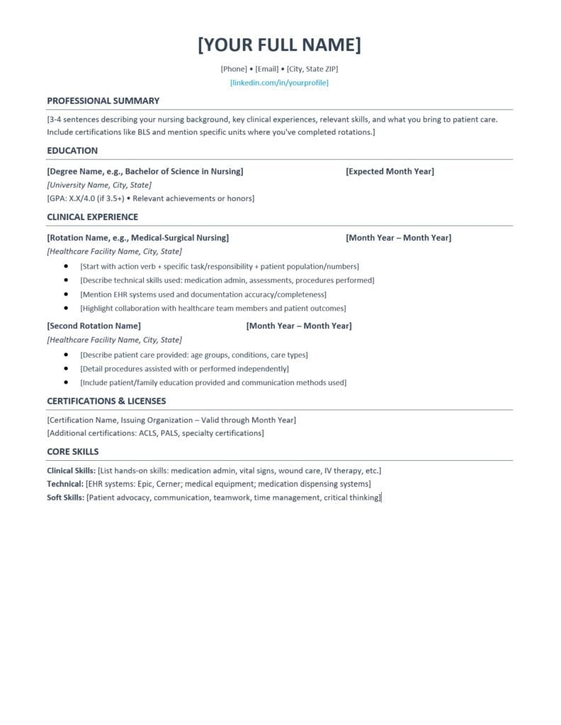 The biggest resume mistake nursing students make is listing what they were supposed to do rather than what they accomplished. “Responsible for patient care” tells recruiters nothing. “Provided direct care to 6 medical-surgical patients per shift, achieving 100% medication administration accuracy and positive patient satisfaction feedback” shows competence.
