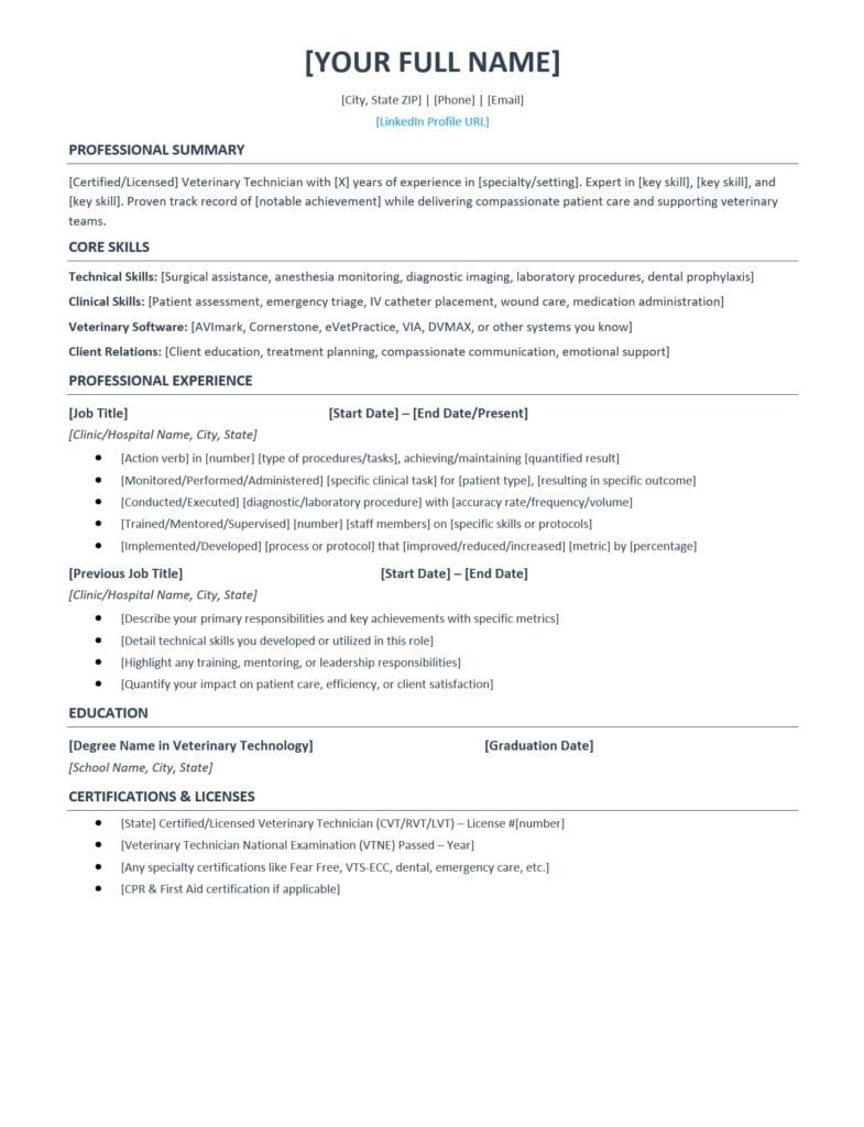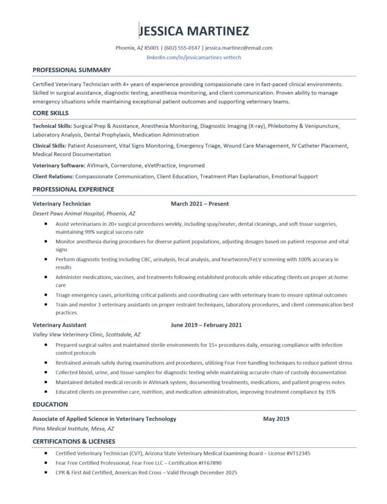 - Veterinary-specific formatting matters more than generic templates because hiring managers scan for clinical skills, certifications, and hands-on experience within seconds