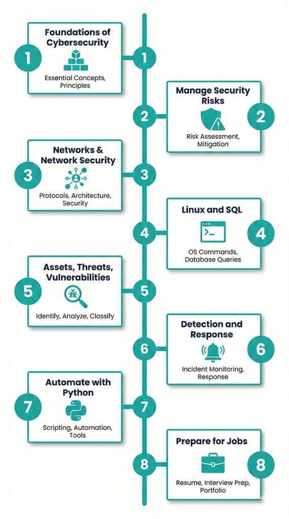 This introduces core security concepts, the CIA triad (Confidentiality, Integrity, Availability), common security frameworks like NIST, and the eight CISSP security domains. You’ll learn what cybersecurity analysts actually do day-to-day and understand different career paths within the field.