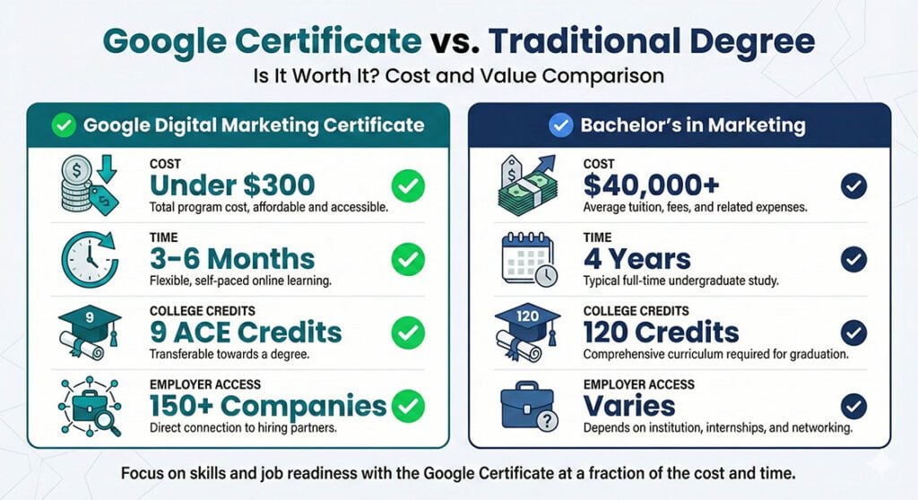 Yes. For under $300 and three to six months of study, you gain hands-on skills in SEO, Google Ads, email marketing, analytics, and e-commerce. The certificate carries strong brand recognition, is accredited for 9 college credits through ACE, and connects you to over 150 employers through Google’s consortium.