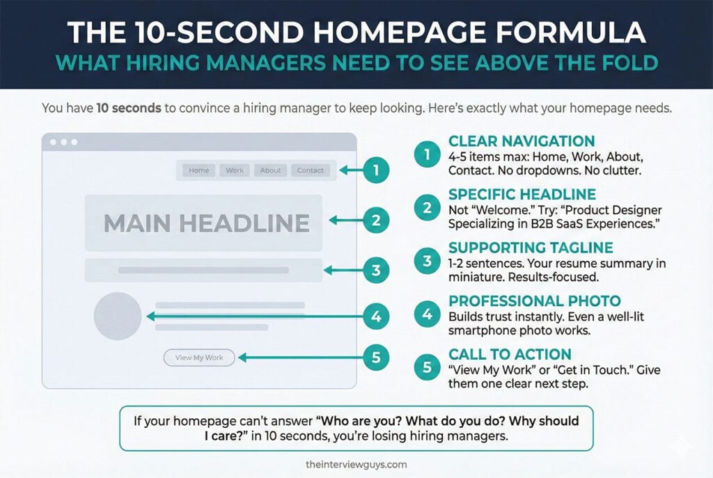 Hiring managers are reviewing dozens of candidates at a time. When they click your portfolio link, you have roughly 10 seconds to convince them to keep looking. Your homepage needs to instantly answer three questions: Who are you? What do you do? Why should I care?