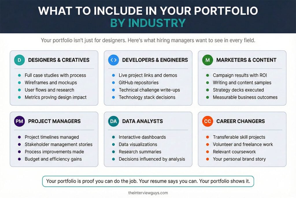 Interview Guys Tip: Not sure your projects are impressive enough? They probably are. You don’t need Fortune 500 client work to build a compelling portfolio. A freelance project, a volunteer initiative, a side project that solved a real problem, or even a well-executed class project can demonstrate your skills when you frame it around the problem you solved and the results you achieved.