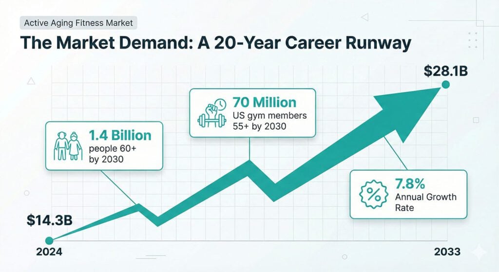 But here’s what makes this demographic shift a genuine career opportunity rather than just a statistic. These older adults aren’t just living longer. They’re living with money, time, and motivation to invest in their health.