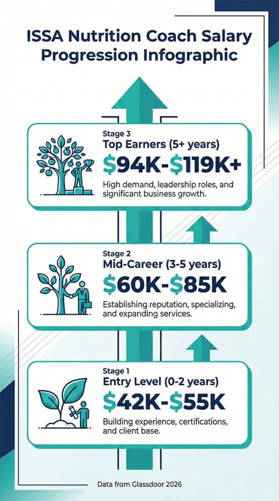 Entry-level nutrition coaches earn $42,000-$55,000 annually. Mid-career professionals with 3-5 years experience earn $60,000-$85,000. Top earners combining multiple income streams can exceed $100,000. Self-employed coaches have the highest earning potential but also the most variability.