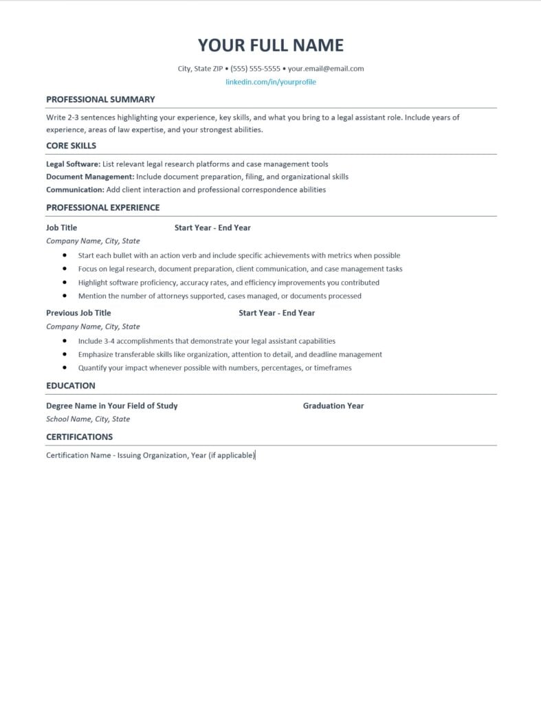 Here’s a professional legal assistant resume template you can download and customize. This template is designed to be both visually appealing and ATS-friendly, with clean formatting that highlights your strengths.