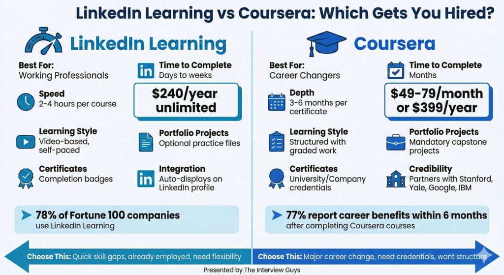 Key takeaway: Career changers need proof of capability. Coursera’s project-based learning provides that proof. LinkedIn Learning’s completion certificates don’t carry the same weight for major career transitions.