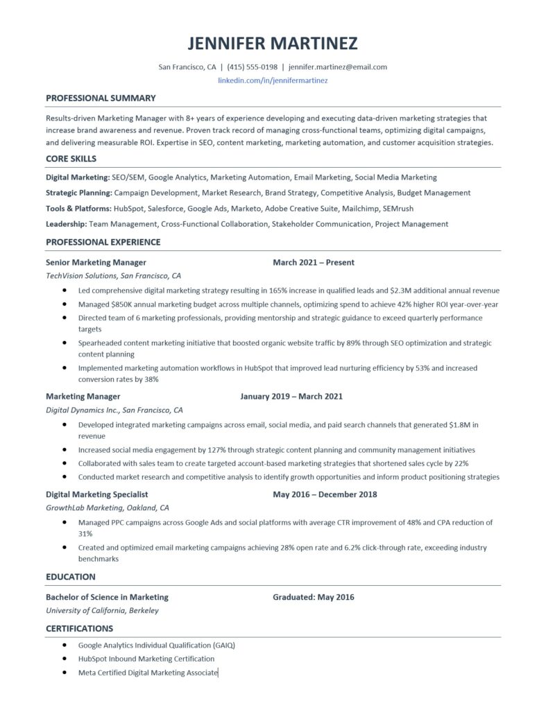 Instead, lead with specific results. “Marketing manager with 8+ years developing data-driven campaigns that increased qualified leads by 165% and generated $2.3M in additional annual revenue” tells a much stronger story. Include your areas of expertise like SEO, content marketing, or marketing automation, and mention any specializations like B2B SaaS or ecommerce.