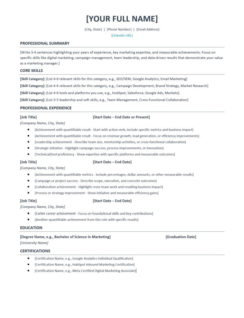 Free Marketing Manager Resume Template 2025: ATS Examples & Writing Guide