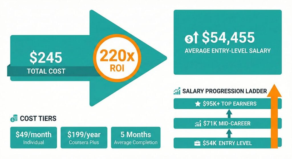 If this certificate helps you land an entry-level role at $54,000, that’s a 220x return on a $245 investment. The certificate alone doesn’t generate the return though. Your hustle, portfolio, and interview skills complete the equation. We’ve got resources on certifications that actually pay well if you want to compare options.