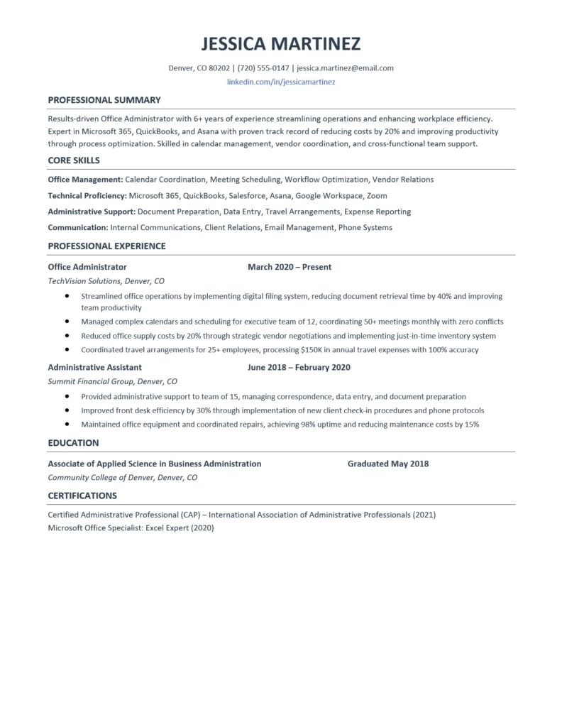 Interview Guys Tip: The most successful office administrator resumes follow a specific format that puts your professional summary and core skills near the top where ATS systems scan first. This strategic placement dramatically increases your chances of passing automated screening.