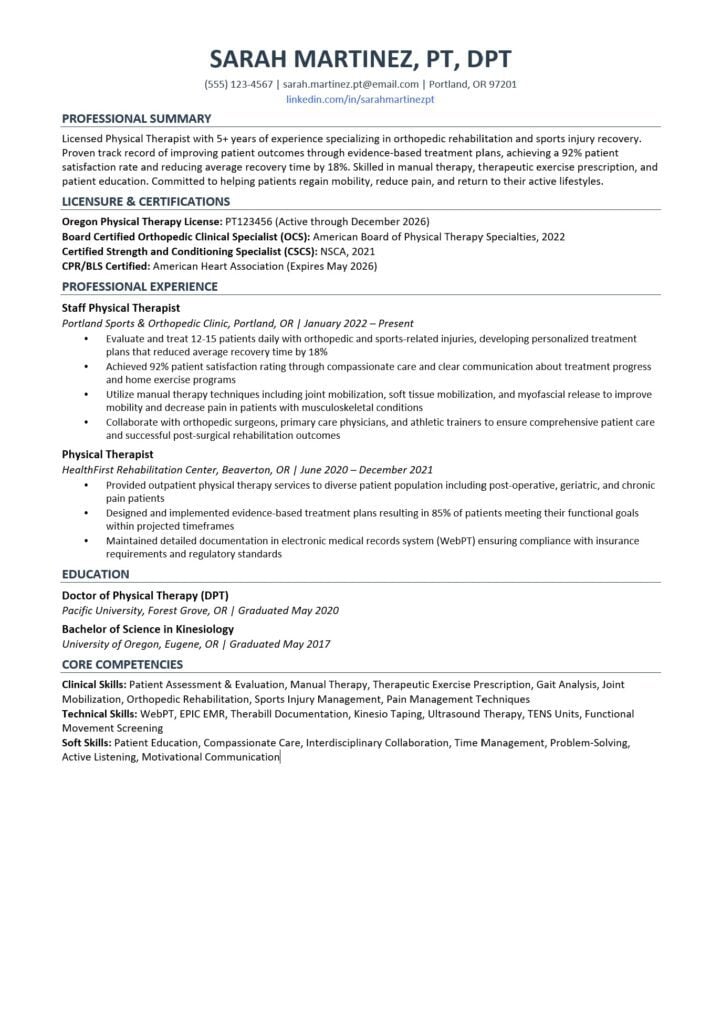 If you have multiple state licenses, list them all. Many healthcare systems operate across state lines, and multi-state licensure makes you a more attractive candidate. According to recent workforce data, there are over 600,000 practicing physical therapists in the United States, so anything that differentiates you strengthens your candidacy.
