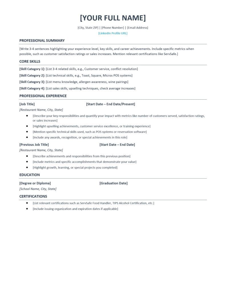 For entry-level servers, shift the focus to transferable skills and enthusiasm: “Energetic hospitality professional with 2 years of customer service experience in retail and food service. Known for building rapport with diverse customers and maintaining composure in fast-paced environments. Recently completed ServSafe Food Handler certification.”