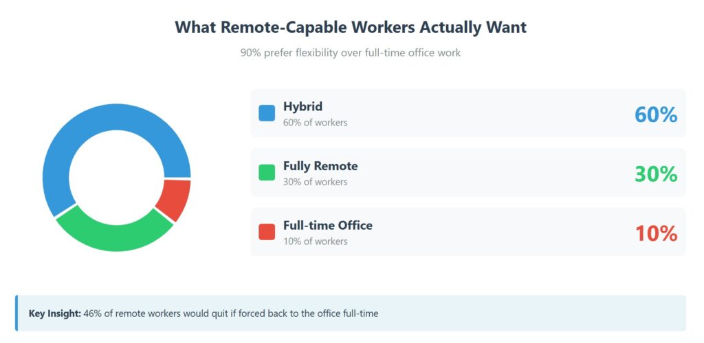 Employee preferences have permanently shifted toward flexibility. The 46% of workers who would quit rather than return to the office full-time aren’t bluffing. They’ve rebuilt their lives around remote work, from relocating to more affordable areas to restructuring family responsibilities. Taking away flexibility now feels like a fundamental violation of the employment contract.