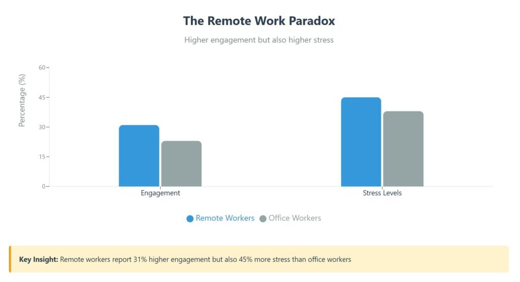Remote work creates a fascinating contradiction: workers are simultaneously more engaged and more stressed than their in-office counterparts.