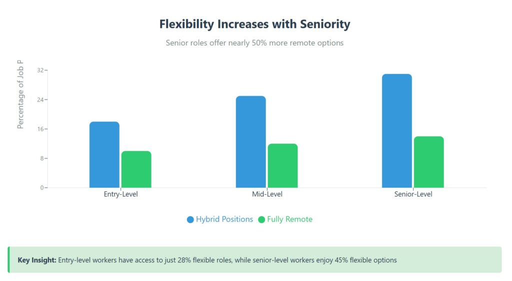 Entry-level positions show the most limited options. Only 28% of entry-level jobs (18% hybrid, 10% remote) offer any flexibility.