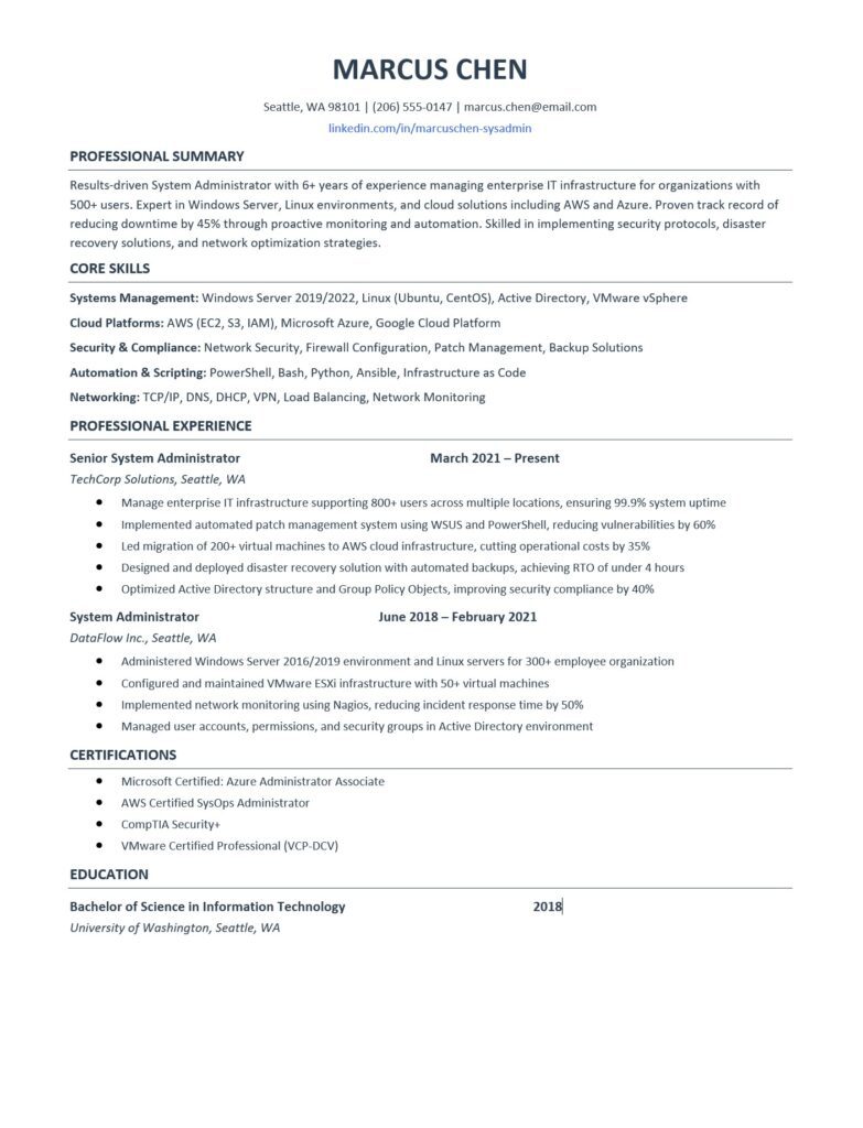 Your resume must immediately establish your value through concrete examples. Instead of writing “responsible for server maintenance,” successful system administrators write “managed enterprise infrastructure supporting 800+ users with 99.9% uptime.”