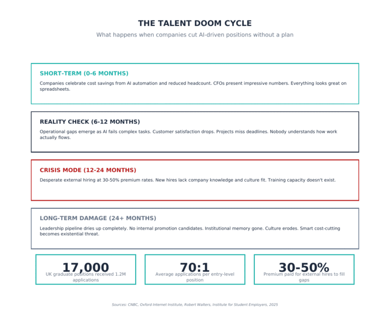 • Companies that cut junior positions create a “talent doom cycle” that forces expensive external hiring at premium rates 12-24 months later when leadership pipelines dry up