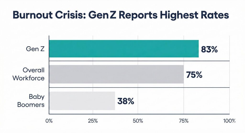 - 83% of Gen Z workers report burnout symptoms compared to 75% of the overall workforce, with financial pressure, entry-level job scarcity, and AI workplace restructuring driving this crisis.